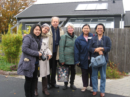 Söndagen 30 oktober bjöd på milt väder och färgstark höstprakt på Skördevägen i Lund. Men för ovanlighetens skull syntes inte solen till som den brukar när det är studiebesök i Villa Trift 3.0. Det var spännande att få ta emot fyra nyanlända tjänstemän från byggdepartementet i Jakarta (Dewi, Disaintina, Teresia och Astri) och Olle och Birgitta från Boverket. Sverige och Indonesien har ett samverkansavtal om utbyte på bl a miljöområdet. I Jakarta är man intresserad av att gå vidare med miljöklassning av bostäder och stadsdelar. Hittills har endast kommersiella byggnader miljöklassats.