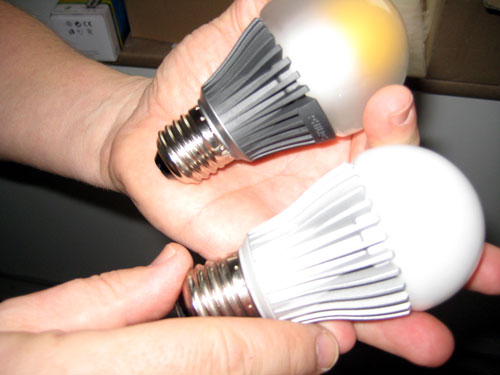 LED-lampor från Philips, 6 resp 7 W, med en brinntid på ca 25 år. Den ena med synlig fosforbeläggning som ska höja färgtemperaturen. Kylflänsarna vid sockeln är viktiga för livslängden eftersom även LED avger värme. Men ljusstyrkan för en LED-lampa av den här sorten motsvarar ungefär en 40-watts glödlampa