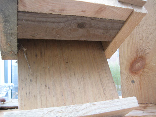 Fjärilarna flyger in genom springorna på holkens sidor. Här syns holken underifrån