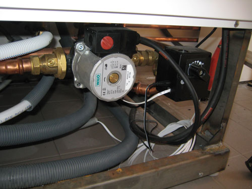 Shuntmotorn som är en del av reglersystemet är den svarta apparaten till höger i bild. Under ackumulatortanken ryms vattenledningar, PEX-rör, kabel till elpatronen och en givare samt cirkulationspumpen till radiatorkretsen. PEX-rör är ett rör-i rör system med ett skyddsrör och ett medierör där vätskan rinner en smart uppfinning för vattensäkerhet och förenklar utbyte om det skulle behövas