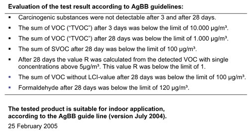 Labbet anser att TVOC-halter lägre än 200 mikrogram/m3 som regel tyder på en god luftmiljö med avseende på flyktiga organiska ämnen. Men WHO är mer tillåtande och anger 300 mikrogram/m3 som TVOC-riktvärde för bostäder. Labbet påpekar också att de inte kan se alla ämnen som finns i luften med den provtagningsmetod som använts.