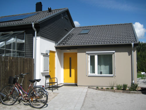 Gavelspetsen med det centrala uteluftintaget i Villa Trift 3.0. På taket ligger fotokatalytiska takpannor av betong, ClimaLife, som renar luften