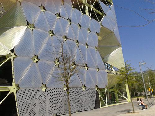 Media TIC i Barcelona är en 38 meter hög kubisk byggnad med säregen exteriör i 9 våningar. Jag har aldrig sett något liknande. Ihåliga kuddar av plast täcker en ljusgrön stålkonstruktion som fylls med kvävgas och fungerar som solskydd för att minska behovet av aktiv kylning.