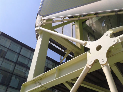 Luftfyllda solskydd av ETFE (ethylen tetrafluorethylen) som en extra hud utanpå stålskelettet