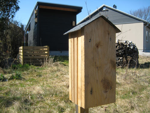 Det är lite frustrerande att se humlor på tomten som tydligt söker ett boställe men inte hittar (eller underkänner) de fina holkarna. Jag har till och med lagt in lite lösull av glasfiber på botten som jag minns att biologen Anna rekommenderade. Beror det på placeringen? Jag har flyttat en av humleholkarna från planket till baksidan av förrådet. Fladdermusholken har jag dessutom flyttat högre upp för att den ska bli lättare att hitta. En lämplig placering är på 2–4 meters höjd i söderläge enligt Naturskyddsföreningen. Hittade fler bra instruktioner för placeringen av fladdermusholkar på Naturhistoriska riksmuseets hemsida. Det är alltid tragiskt med tomma bostäder när det är bostadsbrist.