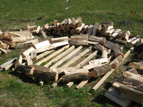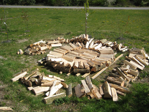 Årets leverans med ca 6,5 m3 som staplats på fram- och baksidan av förrådet