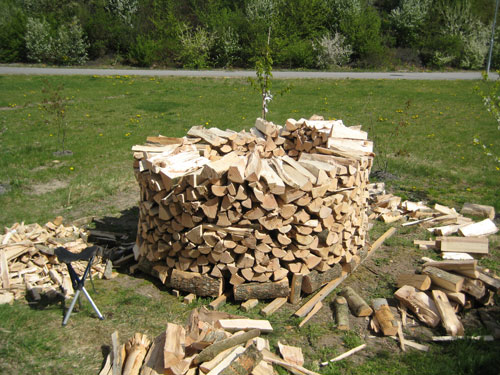 I år köpte vi ved till nästa års uppvärmningssäsong av Lundaved i Torna Hällestad. Priset är 490 kr per m3 stjälpt mått för askved. 10 m3 landade på uppfarten i mitten av april och allt är staplat sedan en vecka. Enligt energiberäkningen är bränsleåtgången uppskattad till 6–6,5 m3 travad blandved. Enligt Energimyndigheten kan man räkna med att 1 m3 travad blandved innehåller 1300 kWh. Under den senaste uppvärmningssäsongen gick det åt ca 4,5 m3. Men askved har ett högre energiinnehåll än blandved. Vi har även eldat en del med briketter.