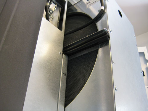 80 m veckad aluminiumplåt överför värmen i frånluften till tilluften som fördelas i sovrum och vardagsrum. Den roterar mellan ett halvt varv till 9 varv per minut
