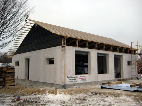 Mitt hus, Villa Trift 3.0, är ett stenhus av lättbetong. Huset stomrestes i januari 2010 utan väderskydd med hjälp av en kranbil på två dagar. Inom en vecka stod alla väggelement av lättbetong på plats och trätakstolarna var täckta med underlagstak. Krönen på elementen är särskilt utsatta och måste täckas vid nederbörd men vi slapp som tur var regn och snö hela veckan. Det är ju inte så lätt att boka om en kranbil…