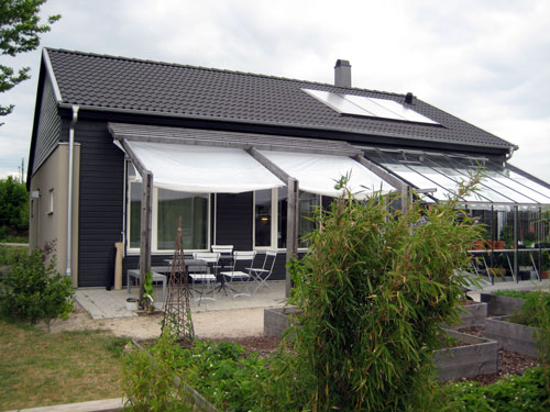 Söderväggen på Villa Trift 3.0 är klädd med mörkgrå träpanel med luftspalt mellan panel och lättbetongelement. Panelen är infäst i stående reglar med papp mellan träreglarna och betongen. en bra konstruktionslösning om man vill säkerställa snabbare uttorkning av lättbetongen som blir särskilt bra med en södervänd panel i mörk kulör