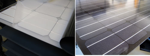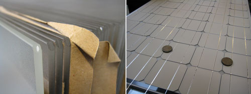 Solceller är otroligt sköra. Vi fick med oss prover men jag tror inte att någon lyckades få hem en intakt solcell. På fabriken sätter man ihop flera solceller till stora moduler som antingen ligger mellan två lager glas eller mellan glas och plast. Plasten kan vara mörk eller vit vilket påverkar modulens utseende. Det finns modeller med eller utan en ram av aluminium.