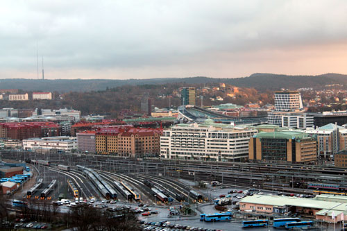 Bangården vid centralen och man anar Ullevis svängda kontur