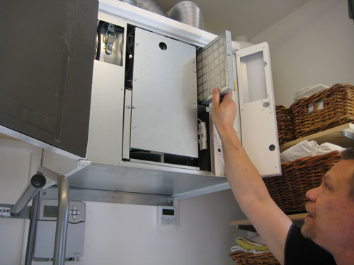 Ventilationsaggregatet Pingvin Eco i Villa Trift 3.0 med roterande värmeväxlare och partikelfilter som renar uteluften och frånluften från badrum, kök och tvättstuga