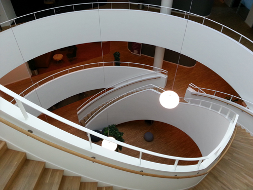 Den nya inredningstrenden i kontorsmiljöer är att göra det hemlikt, varierat och oväntat. Här är riktig ved snyggt travad som en fondvägg (ungefär som vedstaplarna i mitt eget hem)