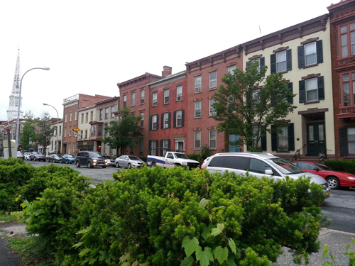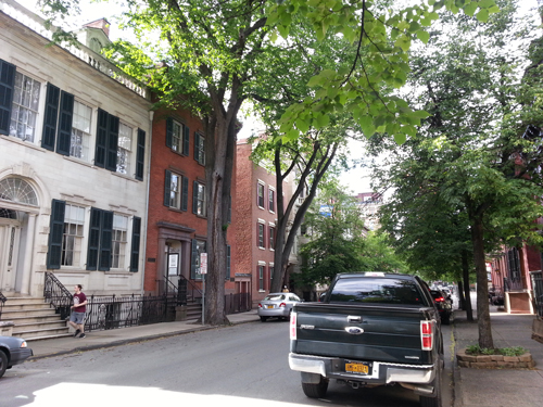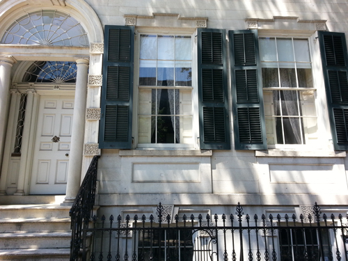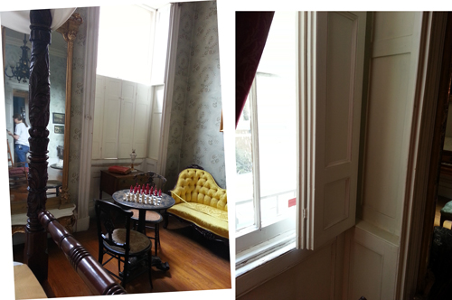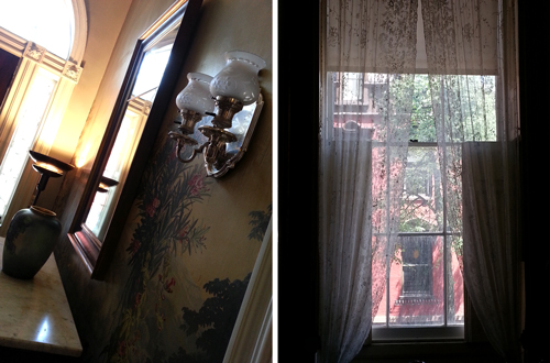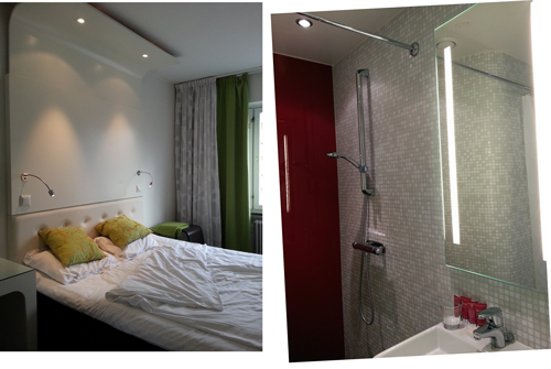 Elite Hotel Arcadia, Stockholm. Detta är ett favoritrum trots att rummet är litet och badrummet kompakt. Byggnaden är från 1950 och den renoverades 2008. Taklampa saknas men ligger man i sängen blir man ändå bara bländad av en ljuskälla i synfältet. Här finns däremot infälld punktbelysning i den svängda sänggaveln som kan vara tänd utan att blända en sängliggande hotellgäst. Anledningen är placeringen rakt ovanför huvudet som gör att ljuskällan är utanför synfältet. Smart belysningsplanering med andra ord. Normalt är takbelysningen centralt placerad i taket. Ett sovrum i hemmiljö har i snitt fyra ljuskällor*: en taklampa mitt i rummet, sänglampor och kankse en bordslampa i fönstret eller på en annan möbel. Notera dessutom gardinerna i fönstret: till skillnad från föregående exempel i Gävle är den ljusa genosmläppiga gardinen närmast insidan av rummet så att rummet kan få en ”ljus vägg” om både den gröna mörkläggningsgardinen och den vita gardinen är fördragen på natten. Med ljusa ytor känns det lilla rummet större och det elektriska ljuset kan studsa tilllbaka så att ljuset sprids jämnare i rummet. Ett jämnt belyst utan skarpa kontraster rum kan vara behagligare för ögat (samtidigt som rummet inte får upplevas som ointressant utan skuggor).