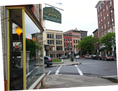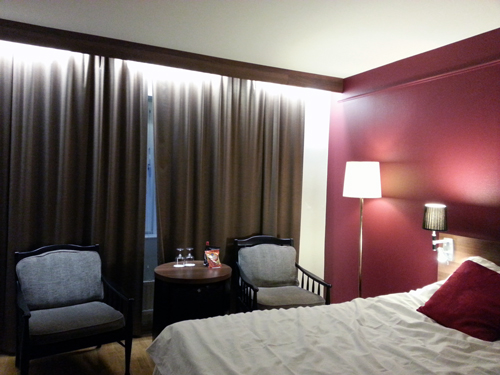 Ett hotell i Gävle. Fin dold belysning i kornischen men som blir ganska ineffektiv eftersom gardinerna är mörka och reflekterar för lite ljus. En ljus gardin framför mörkläggningsgardinen hade återkastat mer ljus och hela fönsterväggen hade blivit ljusare utan skarpa kontraster mellan belysta och mörka partier. Mörka ytor absorberar ljus och kräver därför fler lumen från belysningen för att åstadkomma upplevelsen av ett ljust utrymme. Golvlampor är flexibla om de kan flyttas runt och de bidrar till såväl stämning som funktionellt ljus och känslan av små rum i rummet när de lyser upp en sitthörna eller liknande. Sänglamporna på sänggaveln är värdelösa för den som vill kunna rikta ljuset på boken man läser i sängen.