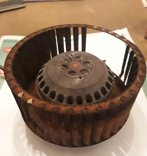 Det som hände tidigt i höstas var att vi upptäckte ett missljud i ventilationsaggregatet och elbatteriet började värma tilluften fast det var milt utomhus (elvärme för att förvärma tilluften till ca 19 grader behövs normalt bara vid minusgrader). Vi hittade inga tänkbara förklaringar i manualen. Reparatören gissade på olika alternativa orsaker till problemet, bland annat att det var något fel på rotorn eftersom den slutade snurra efter ca en halvtimme efter omstart. Det lät ju väldigt oroande att behöva byta rotor efter bara sju år. Efter snabb teknisk support från den finska tillverkaren på svenska fick reparatören tipset att rengöra plåten under tätningen som är av läder. Efterhand fastnar lite rester av tätningen på plåten som gör att friktionen ökar och rotorn får problem med att snurra trots att drivremmen snurrar. Det krävdes alltså bara en grundlig rengöring på ställen som inte var direkt synliga på insidan av plåthöljet.