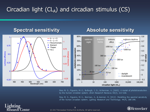 KMG: So returning to your book, I have some more detailed questions. How does the spectral sensitivity curve, or “circadian light” function, compare to what has been done in the Lucas Group at the University of Manchester. They talk about melanopic illuminance, and to me, that seems to be the same as circadian light.