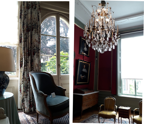 Till vänster syns det ljusa verandarummet mot trädgården. Till höger: den röda salongen med ljuskrona från 1700-talet