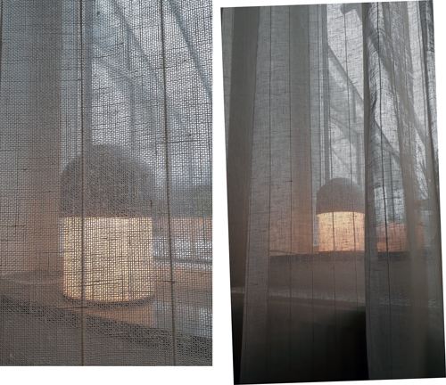 På kvällen hindrar ljusarmaturen bakom tunna linnegardiner insyn från gatan