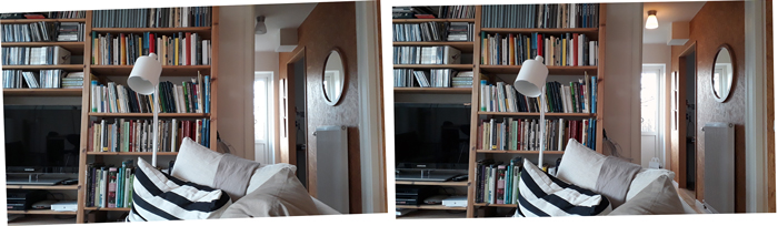 Den utbytta takarmaturen med synlig ljuskälla i hallen som bländar när man ligger i soffan (släckt i bilden till vänster och tänd i bilden till höger) …