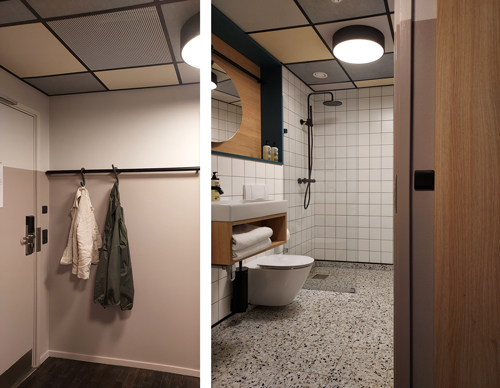 I hotellrummet i Köttbyn i Köpenhamn är kroklisten en återkommande detalj som ibland har krokar för kläder, en flyttbar spegel, förvaring eller en sänggavel I badrummet finns en enkel plafond med behagligt ljus