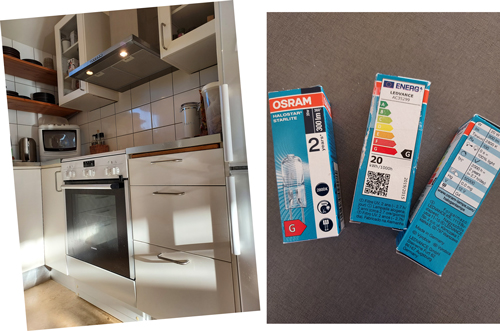 Vi rådfrågade en elektriker för att se om det gick att byta drivenhet och anpassa fläkten för enbart LED-belysning. Men elektrikern hittade inte drivenheten. Det är tråkigt att väsentliga komponenter är dolda och omöjliggör byte när man vill tänka cirkulärt. Eftersom vi vill använda köksfläkten så länge det går (i stället för att byta fläkt på grund av fel drivenhet) har vi köpt ett litet lager av stifthalogen. De får bli hälften/ hälften – en energieffektiv LED och en energislösande halogenlampa i den befintliga köksfläkten i förhoppningsvis 10 år till.
