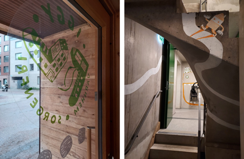 • tidigt samarbeta med andra yrkesgrupper som vittnar om respekt för andra professioners kunskaper, t ex illustratör och landskapsarkitekt. Illustratören Sara Granérs typografi och karaktäristiska väggillustrationer i trapphusen är egensinniga och samspelar med husets riviga och oinsmickrande uttryck.