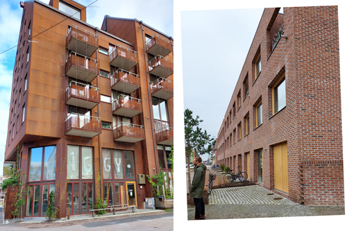 Projektet Iggy till vänster och Tolv hus till höger. Iggy har en fasad av rosttrögt stål. Tegelhuset har en trästomme som är klädd med tegel murat med kalkbruk för att undvika synliga vertikala rörelsefogar (så kallade dilatationsfogar)