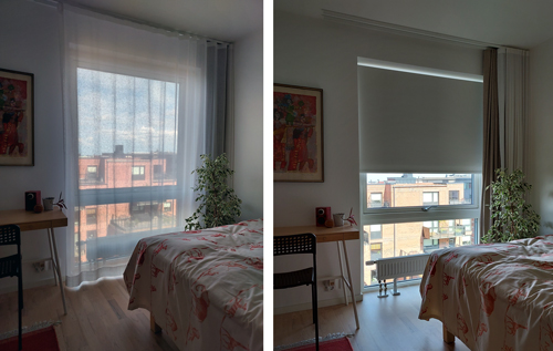 Vänster: Tunn gardin av textil med linneblandning som filtrerar ljus och insyn. Höger: Mörkläggningsrullgardin med ljus insida monterad i fönsternischen
