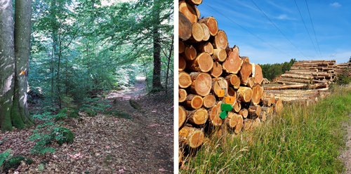Vänster: Varierad topografi och blandning av öppet landskap och lövskog på småstigar utmärkte dagsturen från Stockamöllan till Höör. Höger: Skåneledens märkning kan vara lätt att missa