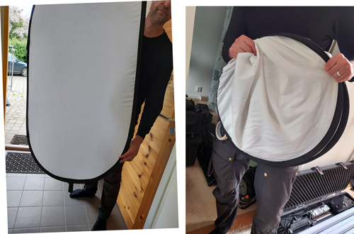 Nicholas håller upp reflektorn/diffusorn av vitt ljusgenomsläppligt tyg som var med i flera scener