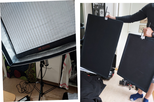 Vänster: en RGB roll flex LED Light. Höger: Daniel arbetar med de svarta flaggorna för att t ex skapa ”negative fill” (dvs ökad kontrast om ljuset är för jämnt)