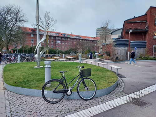 Problemet är att flera studenter inte parkerar sina cyklar i cykelställ utan ställer dem ogenerat huller om buller rakt framför huvudentrén. Det finns tillräckligt med cykelställ men inte alldeles invid entrén. I grannhuset LUX nedanför gatan råder det däremot cykeldisciplin. Här blockeras varken ingången till LUX eller bänkarna utanför av cyklar. Så istället för att sätta upp förbudsskyltar (som visades sig vara verkningslösa) föreslog jag för landskapsarkitekten på Akademiska Hus att de borde sätta upp bänkar längs alla planteringar framför entrén. Mitt argument var att man som student troligtvis inte vill försämra för sina studiekamrater som uppskattar möjligheten att njuta av lunchen på en bänk vid entrén i solen. Här finns nämligen andra bänkar i närheten där säkert de flesta studenterna har slagit sig ner någon gång. Och mycket riktigt – numera står inga cyklar framför de nymonterade bänkarna trots att det är vinter och det dröjer tills man kan sitta på de nya bänkarna och äta utomhus i vårsolen.