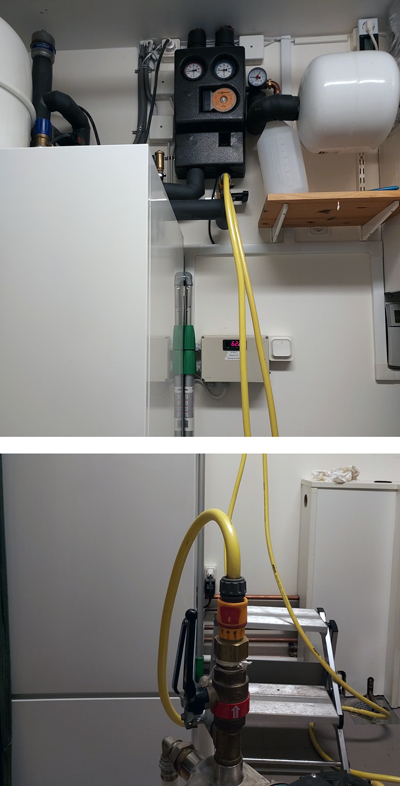 Det hela började med att vi upptäckte att elpatronen bara ”orkade” värma tanken en begränsad tid efter att rumstermostaten kallat på värme på morgonen (efter nio timmar lång nattsänkning av inomhustemperaturen). När rumstermostaten efter nio timmar registrerar att rumstemperaturen sjunkit under det inställda börvärdet på drygt 20 grader skickar den en signal till shunten under tanken. Shunten öppnas då och skickar ut värmevatten från tanken till radiatorerna. Normalt ska elpatronen hålla 60 grader i övre delen av tanken men under den senaste månaden fungerar det endast ett tag. Elpatronen levererar plötsligt ingen värme längre och då sjunker förstås temperaturen i tanken i takt med att värme tappas av. Då behövs en annan värmekälla och under denna snörika och kalla månad har det inneburit vedeldning morgon och kväll. Vanligtvis eldar vi enbart på kvällen och låter elpatronen värma på morgonen. Solfångarna har tyvärr varit snötäckta eller så har det varit för mulet för att det ska ge tillräckligt med solvärme. (Men även om det är minusgrader och snö på takets solfångare kan solen värma de flesta rummen genom stora södervändafönster.)