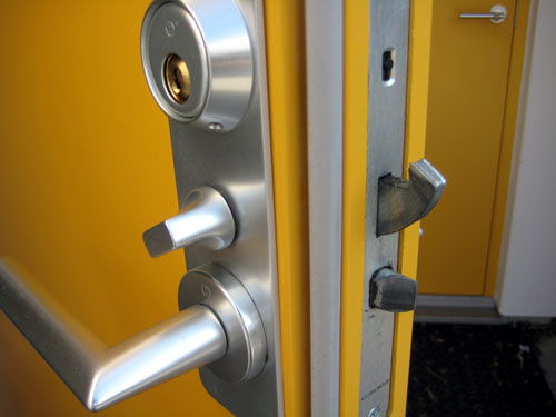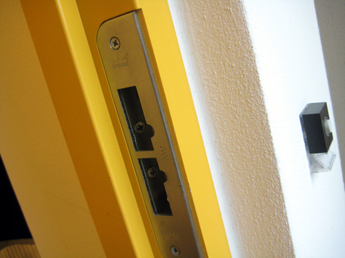Låset i entrédörren har bytts ut för andra gången! Samma problem som förra gången. Tryckkolven eller fallregeln som den också kallas fastnar och dörren måste låsas med nyckel eller vred för att hållas stängd. Det är känt att Assa har haft problem med sina C2002 lås. Men Assa ställer upp med snabb service och skickar nya lås – varje gång. Tydligen gjordes en större förbättring i september men vi chansar inte längre utan har istället valt ett lås från Dorma. Dorma 9132 känns mer rejält och låssmeden har enbart bra erfarenheter av Dormas lås. Vredet kan kopplas bort via knapp och det återkopplas automatiskt när man låser upp. Assa har samma funktion. Den tydligaste synliga skillnaden är att Dormas lås har en hakregel som fälls ut och går neråt när dörren ska låsas medan Assas går uppåt. Låsljudet är annorlunda. Dorma låser med eftertryck och Assa låter lite spädare.