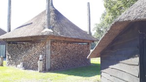 Staplad ved under tak byggt i lokal byggnadstradition med vass och höga hörnstolpar