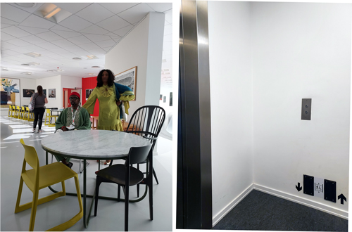I receptionen på bottenvåningen valdes fasta höjder på receptionsdisken istället för en höj- och sänkbar disk. Guiden förklarar att det var ett medvetet val för att undvika att göra ett nummer av individuella skillnader (dvs undvika att under flera sekunder sänka från ståhöjd till en höjd anpassad för rullstolsburna och barn).