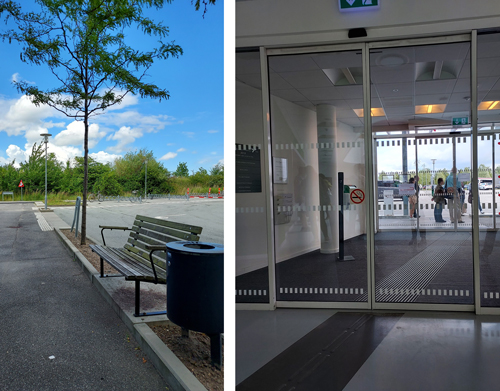 Handikapporganisationernas kontorshus genomsyras av medvetet gestaltade lösningar som engagerar flera sinnen. Jag beskrev till exempel akustiken och ovanljuset i förra inlägget. Förflyttning såväl innomhus som utanför byggnaden är lika viktig. Bänkarna utanför inkräktar inte på gångytan. De är istället placerade på den upphöjda nivån där de samsas med träd och andra gatumöbler. I byggnadens vindfång har ledstråket en annan riktning på mattluggen för att underlätta orienteringen. Personer med nedsatt syn kan känna sig fram med hjälp av undersidan av skosulorna.