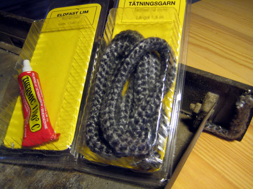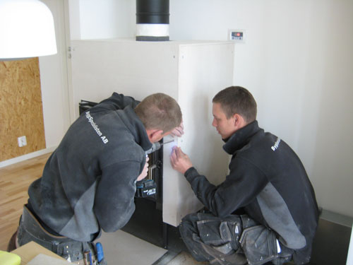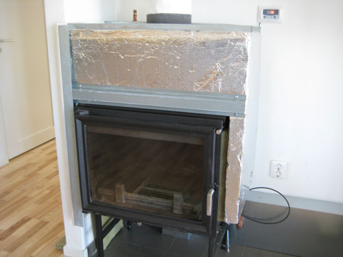 Den vattenmantlade kaminen fick i somras en ny dubbelglaslucka som invigdes i slutet av oktober 2012. Värmestrålningen genom luckan har minskat som vi hoppades på. Så mycket som möjligt av värmen ska ladda ackumulatortanken istället för att värma rummet genom strålning. Just nu eldas askved från en två år gammal vedstack med ett energiinnehåll på 2 900 kWh per fast m3, 1 740 kWh per travad m2 (2 900 kWh x 0,6). Källa: Virkesmätarföreningen