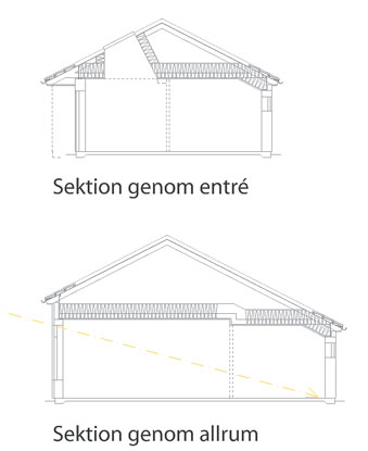 Fackverkstakstolar och vindsbjälklag av trä med 500 mm lösullisolering. Kallvind utan takfotsventilation. Takmaterial av betongpannor och takintegrerade solfångare. Innertak av slät målad gips.